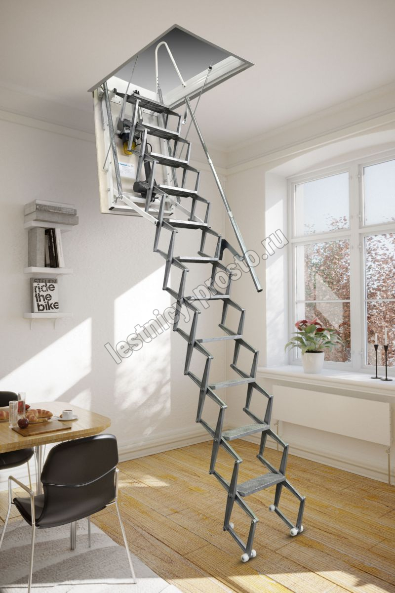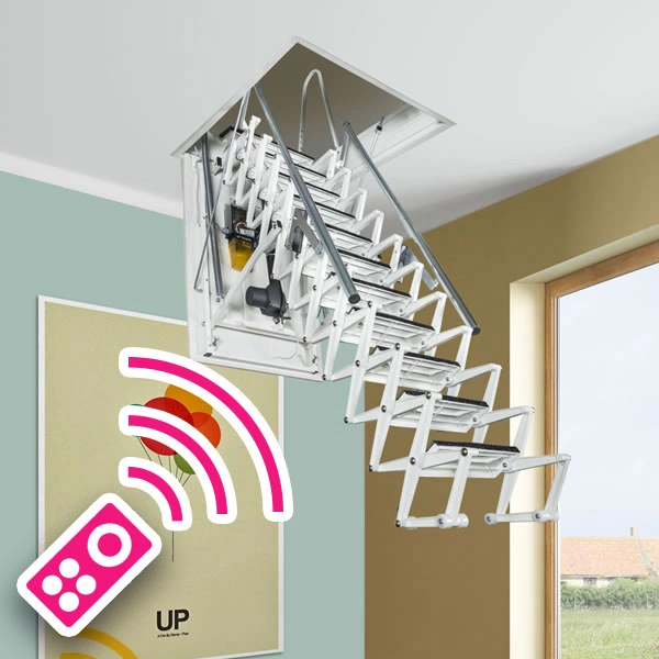 Автоматическая раздвижная ножничная чердачная лестница, с электромотором для дистанционного открывания.