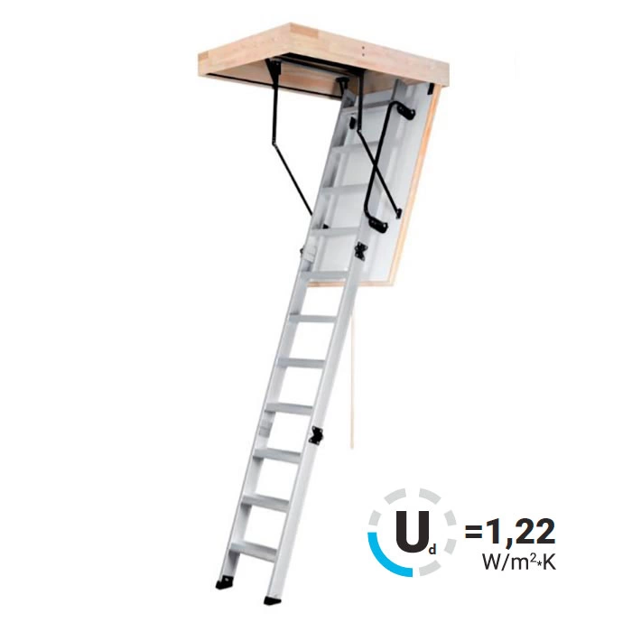 Складная 4-х секционная чердачная лестница. Рабочая поверхность полностью выполнена из алюминия. Термоизоляционная крышка типа "сэндвич" имеет усиленную теплозащиту, облицована с двух сторон ДВП белого цвета. По контуру короба имеется уплотнитель; Все металлические элементы лестницы покрыты порошковой краской.