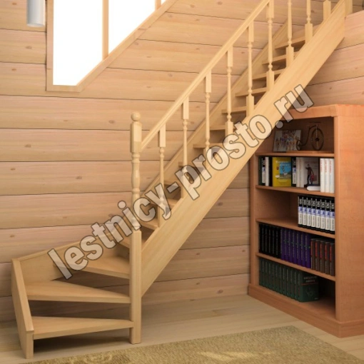 Классическая деревянная лестница с удобным забежным поворотом. Лестница без какого-либо покрытия. В комплекте элементы лестницы и ограждения в разобранном виде, необходимый крепеж, инструкция по сборке.
