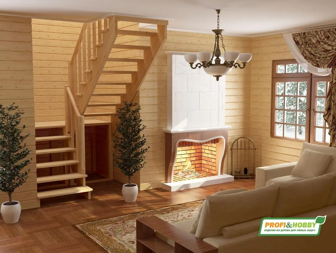 Ступени и поручень лестницы изготовлены из ясеня, остальные элементы из сосны.