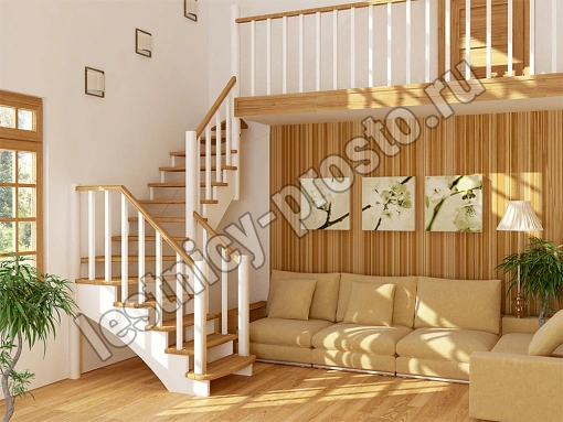 Ступени и поручень лестницы выполнены из ясеня, остальные элементы из сосны.