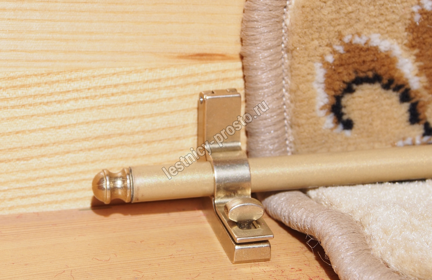 Ковродержатель комплектуется двумя держателями и двумя заглушками из латуни, а также трубкой из металла, окрашенной порошковым способом в цвет "золото".