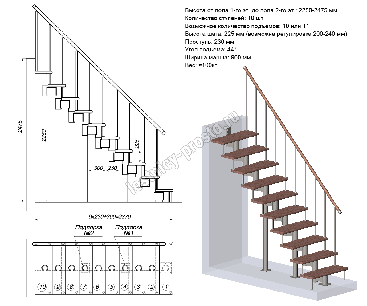 Высота лестницы 2250 - 2475 (10 ступеней) мм