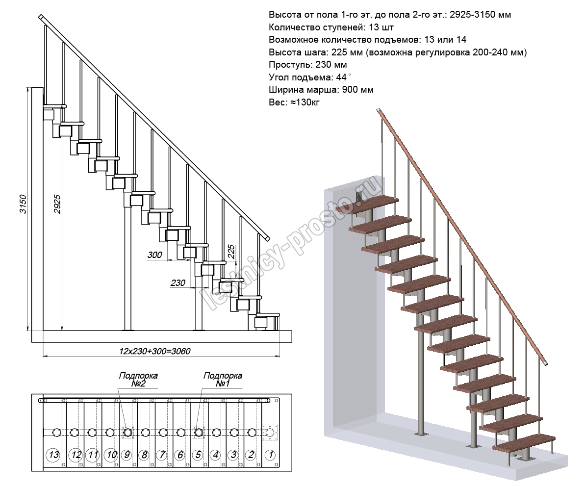 Модульная лестница PROSTO Module прямая/ h337.5 см