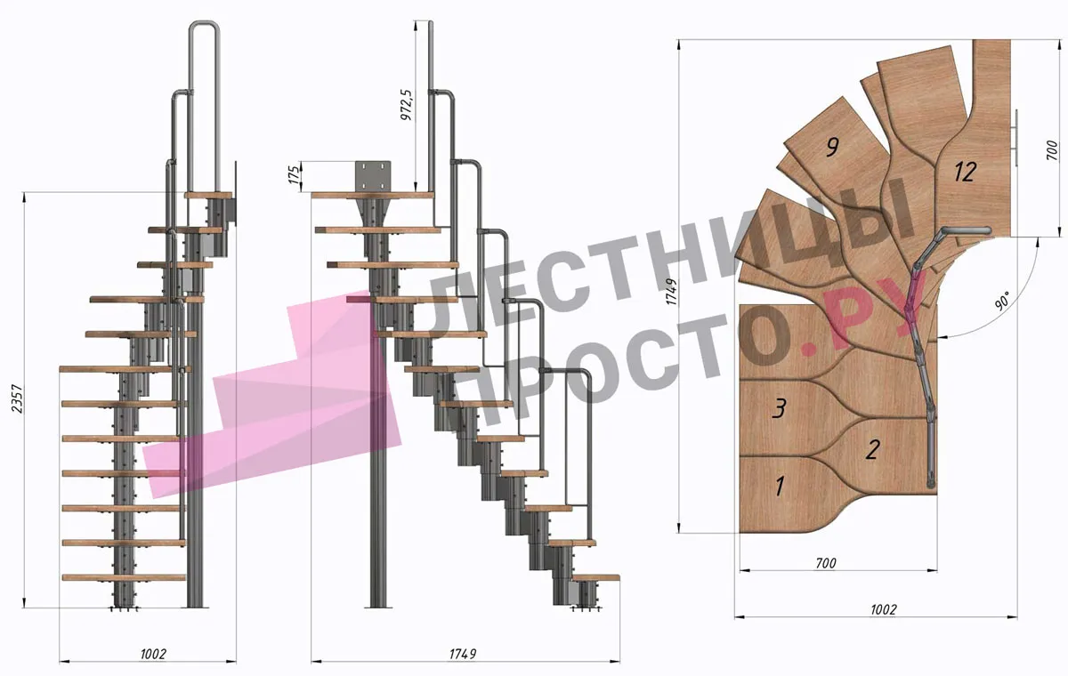 Лестница Prosto Urban Black гусиный шаг 700 мм, h216-312 см (12 ступеней), бук