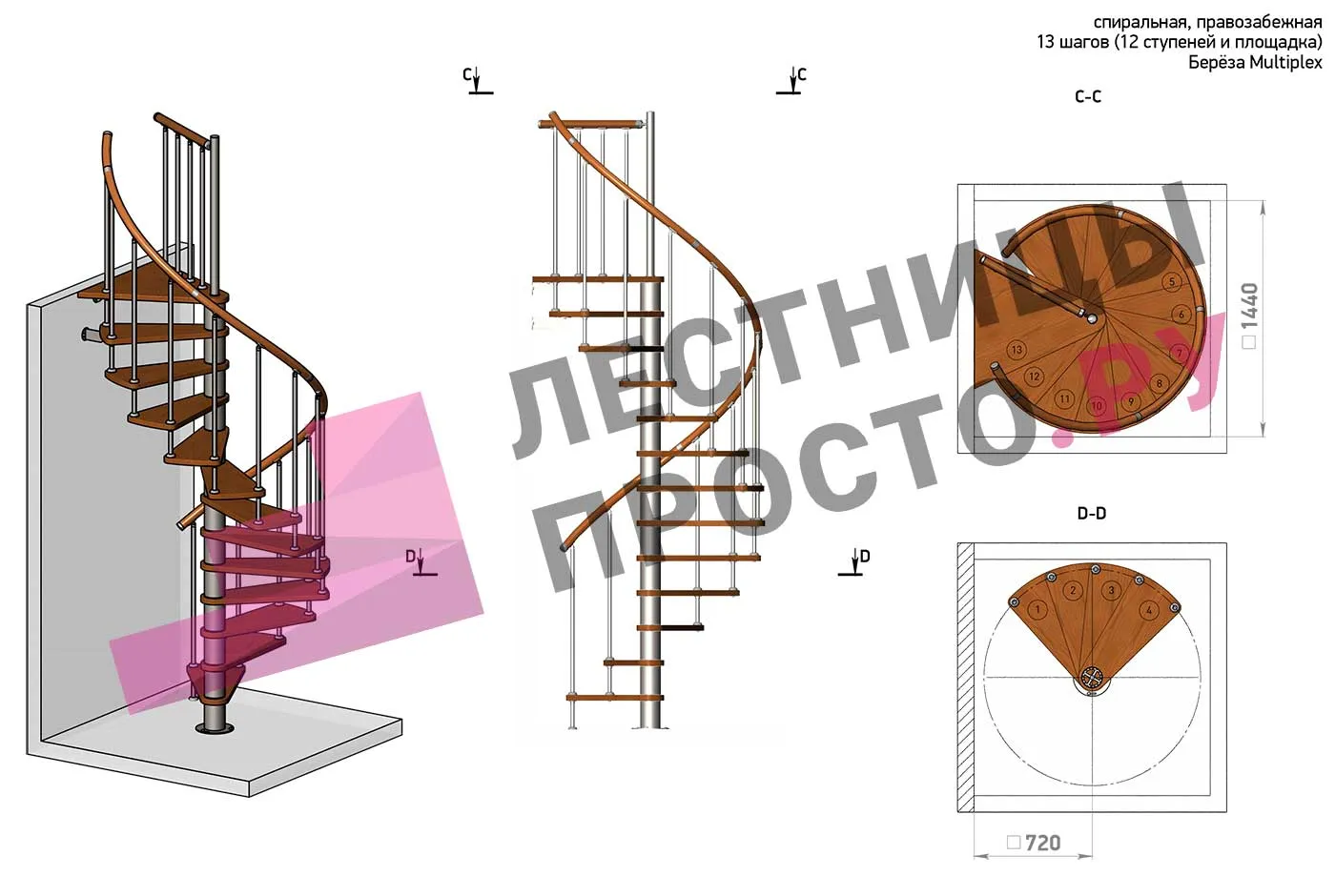 Решение об ориентации поворота лестницы принимается при сборке (комплект собирается и в правозабежную, и в левозабежную лестницу)