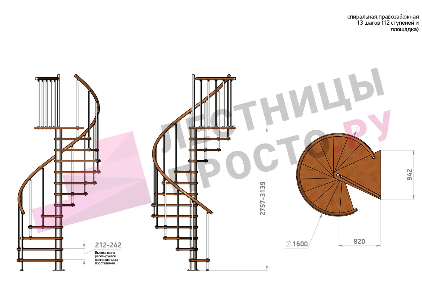Высота ступеней регулируется с шагом 3 мм. в пределах 212-242 мм., благодаря чему, лестница прекрасно подгоняется под необходимую высоту.