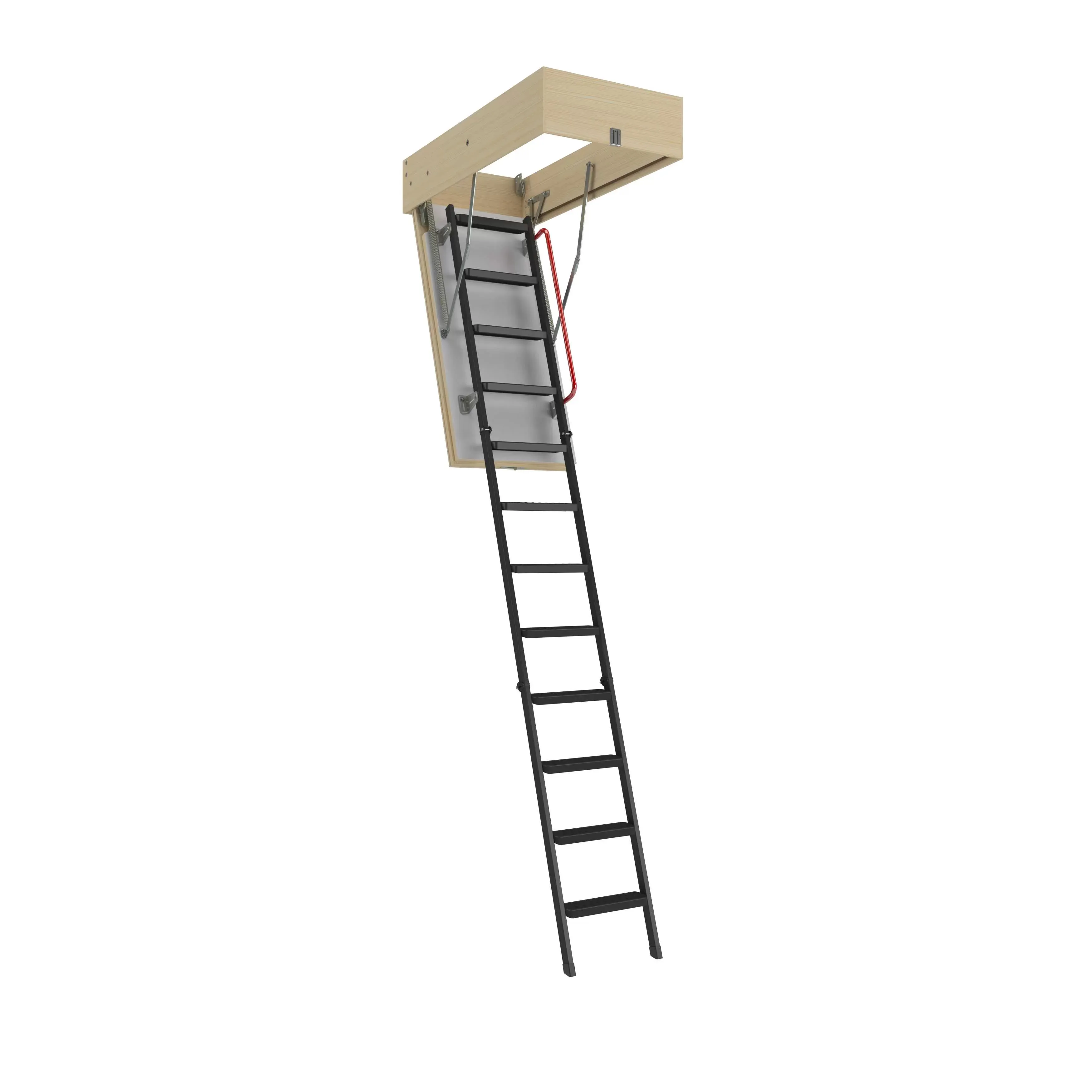 Лестница представлена в двух вариантах: с поворотом направо и с поворотом налево. Благодаря возможности регулировать высоту шага с помощью пластиковых вставок (входят в базовый комплект), высоту лестницы можно варьировать в пределах от 2860 до 3090 мм. Кроме того, купив дополнительную секцию для этой лестницы, можно поднять высоту до 3320 мм. Поручень изготовлен из массива бука в тон ступеням. Ступени и поручень покрыты износостойким защитным лаком.