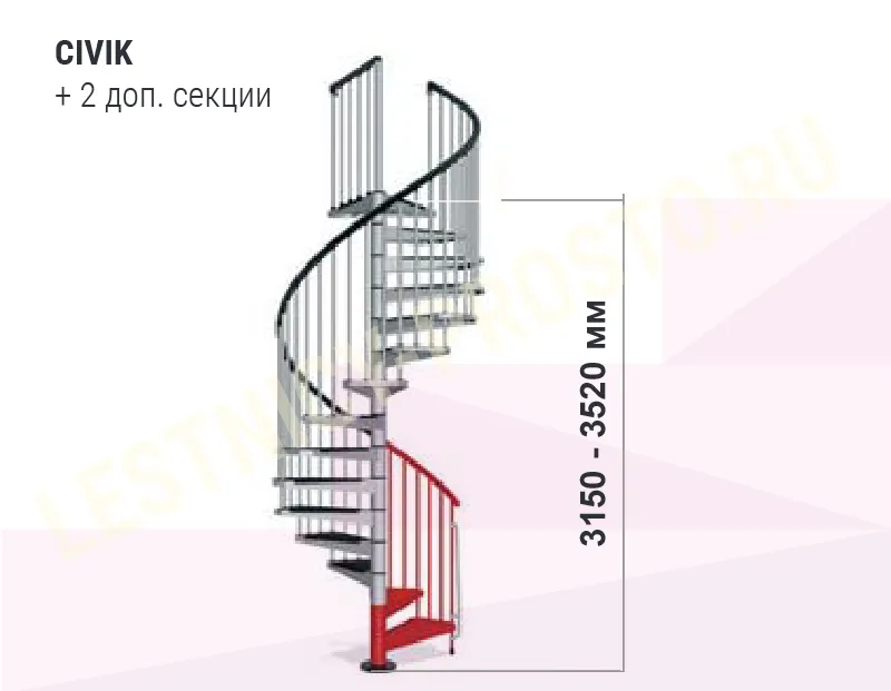 Ступени лестницы покрыты специальными накладками из износостойкого антискользящего материала. Площадка лестницы имеет универсальную форму, позволяющую встраивать лестницу в потолочные отверстия любой формы и размера. Высота лестницы регулируется при установке. С помощью специальных дополнительных секций, высоту лестницы можно увеличить до 3760 мм. (Секции покупаются отдельно). Во время сборки, задаётся необходимое направление поворота лестницы. CIVIK изготовлен из штампованной стали, окрашен в черный цвет (RAL 9017), белый (RAL 9010) или серый (RAL 9006). Отделка лестницы всегда в черном цвете. Перила из полиуретана с алюминиевым сердечником черного цвета, как и износостойкие нескользящие панели на ступенях.